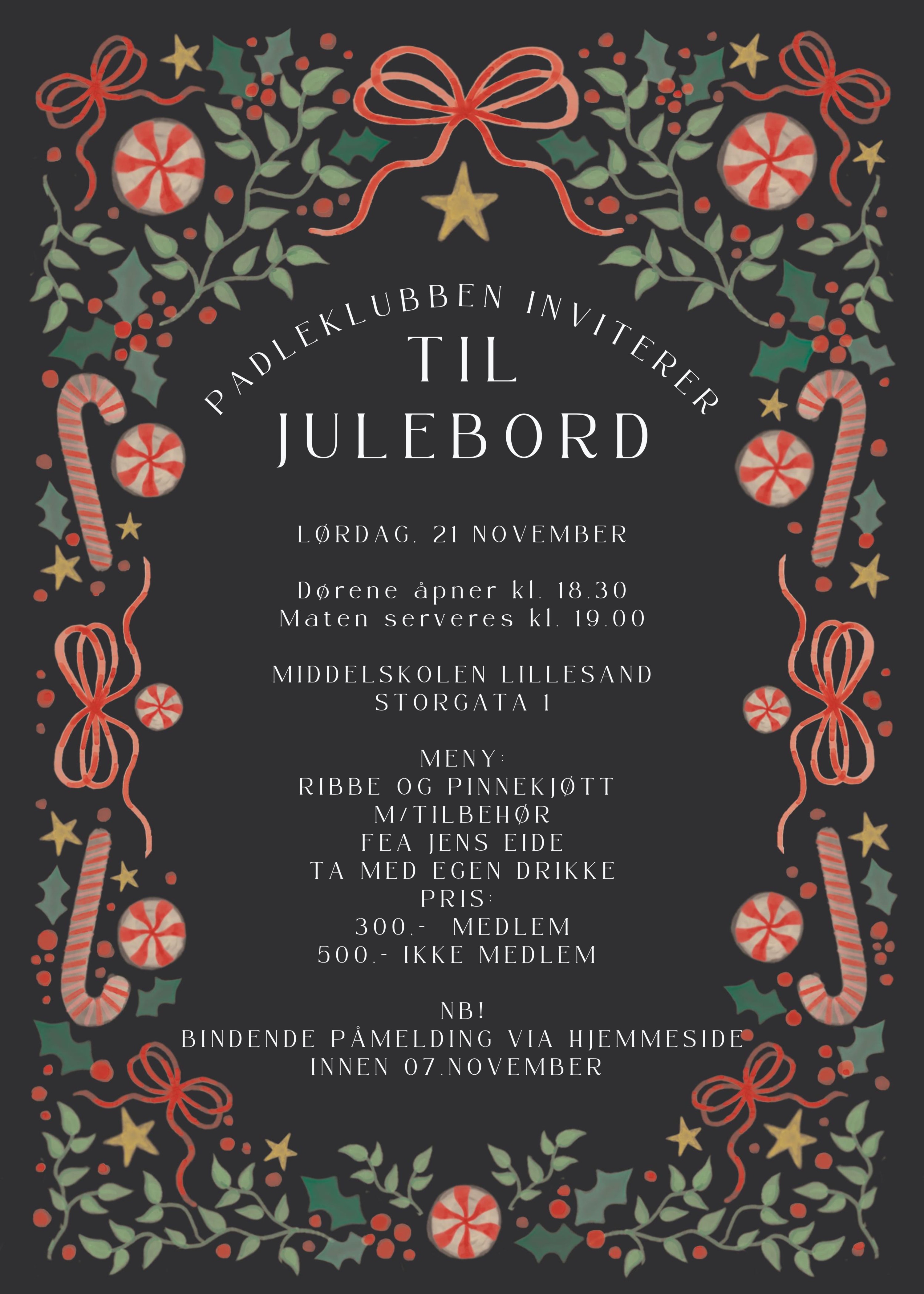 Vi inviterer alle medlemmer – med eller uten følge – til en kveld fylt med god mat, latter og ekte julestemning. Dette er kvelden for å legge padleårer og våtdrakter på hylla og ta på finstasen!